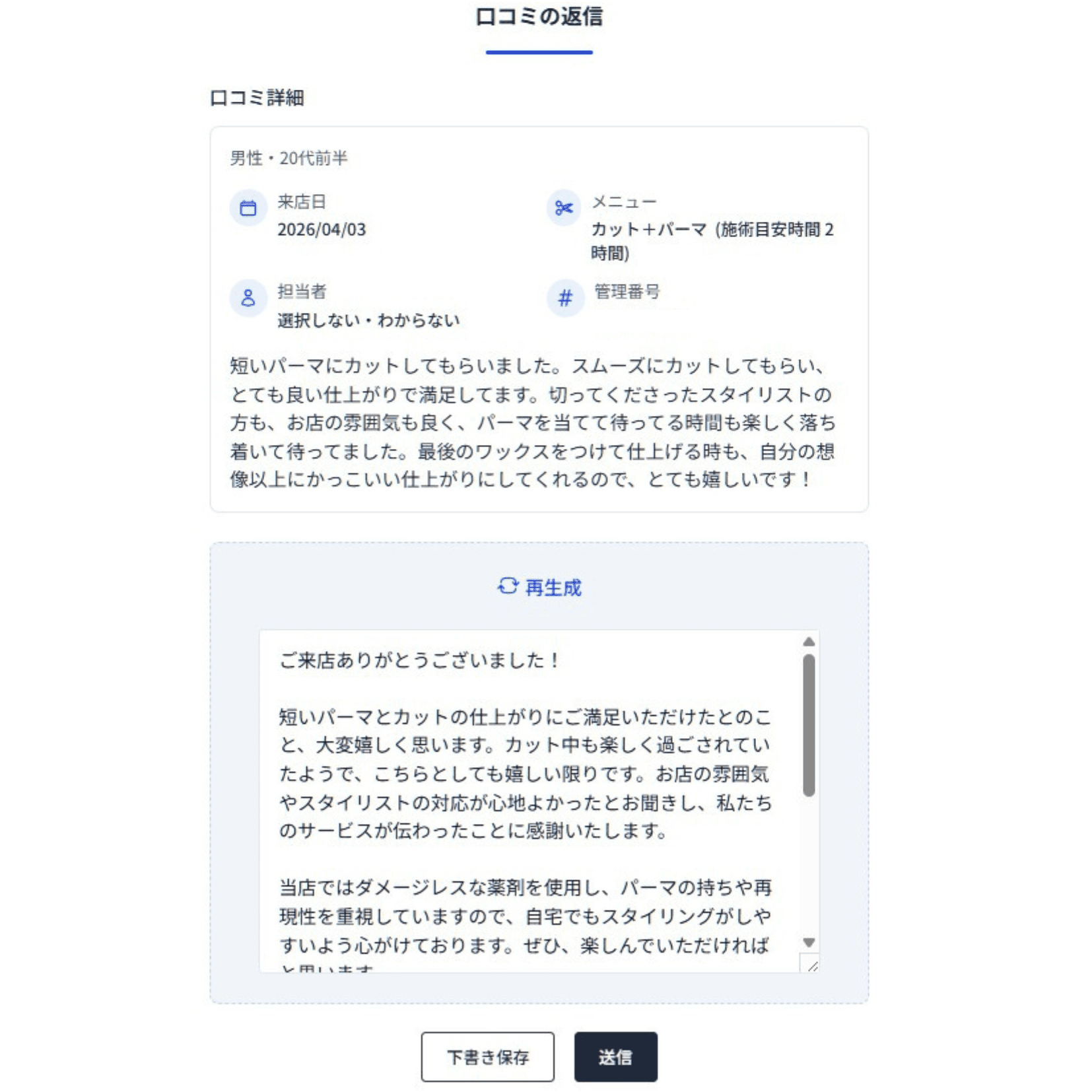 生成された返信文のニュアンスが「少し違う」と感じた場合は、ボタン一つで再生成が可能です。何度でもやり直せるため、サロンのトーンや温度感に合った返信文に仕上げることができます。